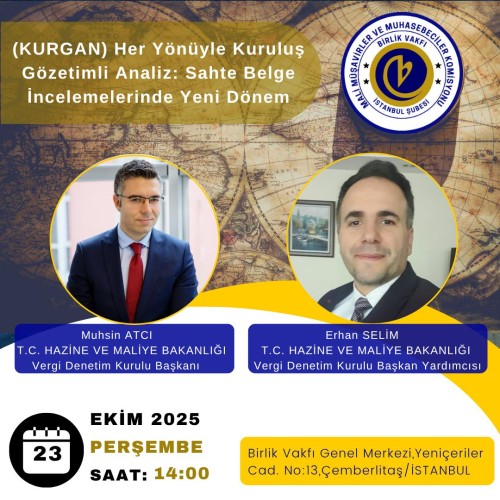 Birlik Vakfı İstanbul Şubesi Mali Müşavirler ve Muhasebeciler Komisyonu'nun düzenlediği konferansta, T.C. Maliye ve Hazine Bakanlığı Vergi Denetim Kurulu Başkanı Muhsin Atcı ve Başkan Yardımcısı Erhan Selim, “(Kurgan) Her Yönüyle Kuruluş Gözetimli Analiz; Sahte Belge İncelemelerinde Yeni Dönem” konulu sunumu yapmıştır.
